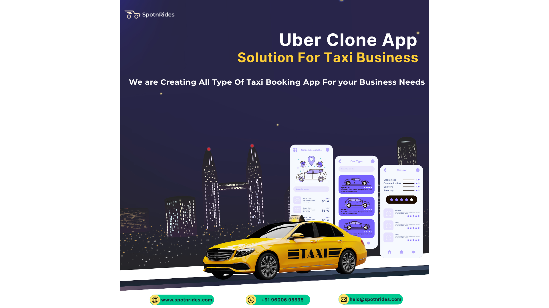 Uber Clone empowers business owners to launch a fully-featured ride-hailing platform with real-time ride tracking, multiple vehicle types, driver management, and advanced payment integration. Enter the booming taxi market and capture customers quickly. Transform your entrepreneurial dream into reality today with SpotnRides.
